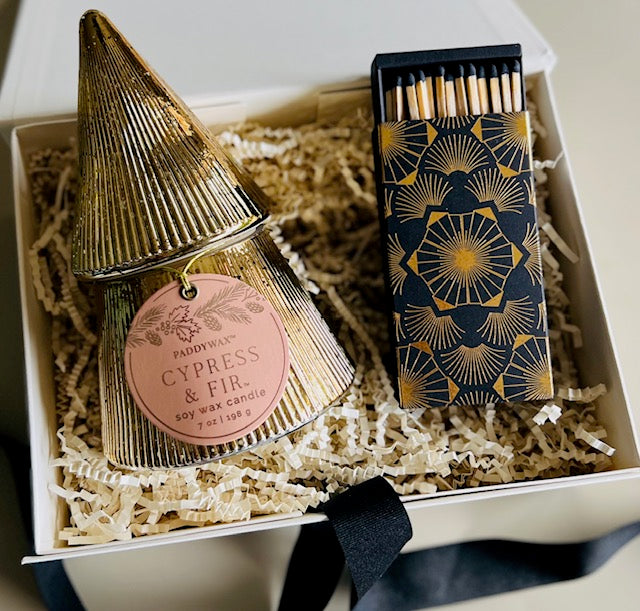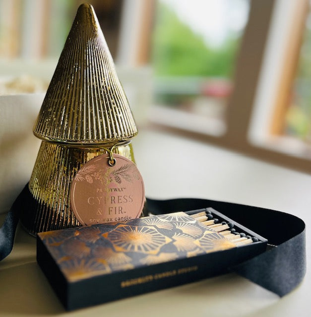 This beautiful gold tree Cypress & Fir Scent candle will impress!